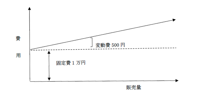 固定費を1万円、変動費を500円とすると考え方としては、商品が1個売れるたびに500円が費用として発生し、固定費は商品が売れても売れなくても恒常的に発生するということです。費用のイメージは(図1)、損益分岐点の捉え方は(図2)のとおりとなります。